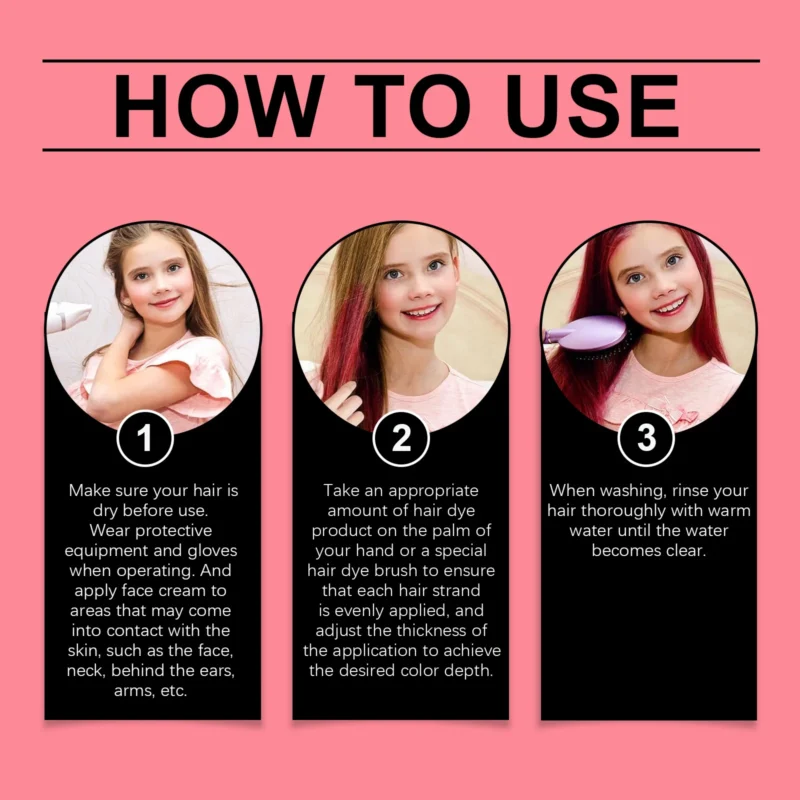 Our gentle children’s hair color balm features plant-based ingredients including glycerin, ginseng extract, and sweet almond oil. This easy-rinse formula delivers instant, vibrant color that washes out completely without professional products.