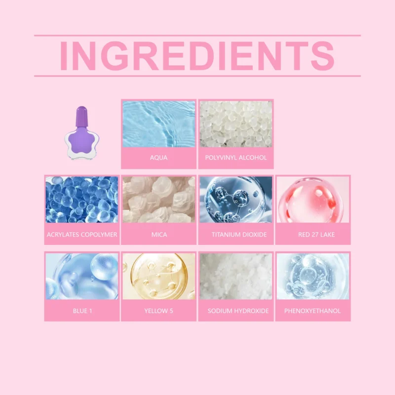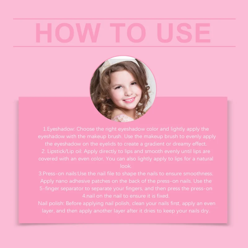 Safe Ingredients: Our children’s makeup set features carefully formulated components – eyeshadow contains talcum powder and mica, lip oil uses mineral oil and hydrogenated styrene/isoprene copolymer, lipstick includes mineral oil and synthetic beeswax, while nail polish features polyvinyl alcohol and acrylic copolymer.